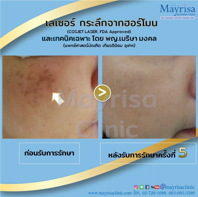ฝ้า ลักษณะจะเป็นปื้นคล้ำเรื่อๆ มักพบในเพศหญิงวัยกลางคน มีสาเหตุหลักมาจากแสงแดดและฮอร์